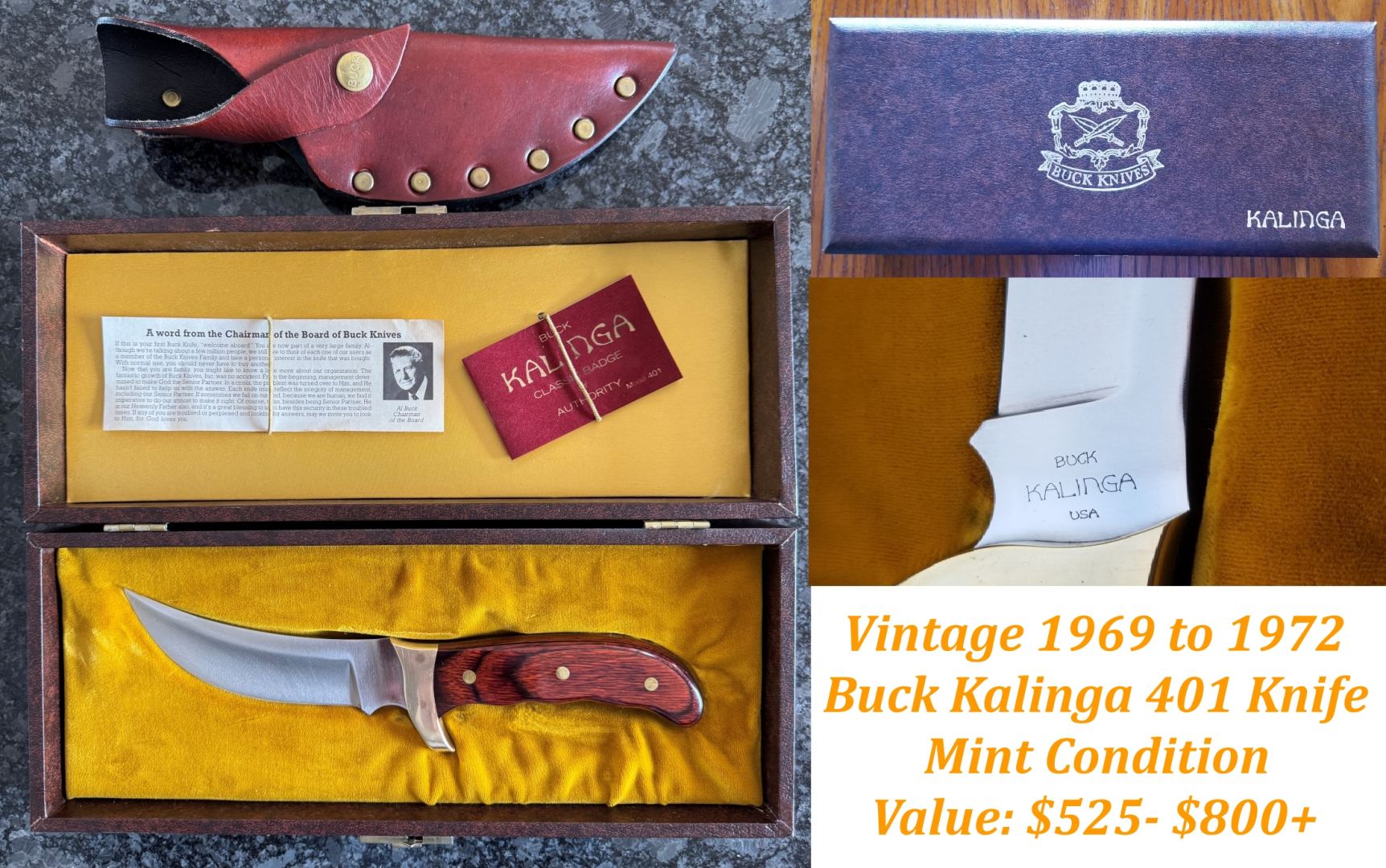 MINT 1969-72 Buck Kalinga 401 – RARE Brown & Gold Box – Unsharpened w/ Brown Sheath