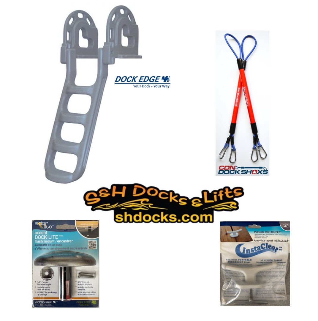 “Dock Edge” Folding Ladder, 2 Cdn Dock Shoxs mooring harnesses, 4 flush mount solar dock lights, 4 “Instacleat” Portable/Permanent dock cleats.